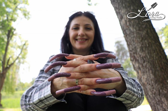 Long french finger nails and toenails. Photoshoot for the video, where I am walking in the park near the lake.